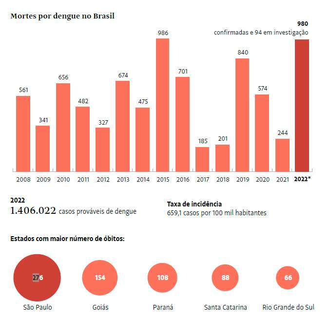 Para compartilhar esse conteúdo, por favor utilize o link https://www1.folha.uol.com.br/equilibrioesaude/2022/12/com-980-mortes-por-dengue-brasil-se-aproxima-de-recorde-em-um-ano.shtml ou as ferramentas oferecidas na página. Textos, fotos, artes e vídeos da Folha estão protegidos pela legislação brasileira sobre direito autoral. Não reproduza o conteúdo do jornal em qualquer meio de comunicação, eletrônico ou impresso, sem autorização da Folhapress ([email protected]). As regras têm como objetivo proteger o investimento que a Folha faz na qualidade de seu jornalismo. Se precisa copiar trecho de texto da Folha para uso privado, por favor logue-se como assinante ou cadastrado.